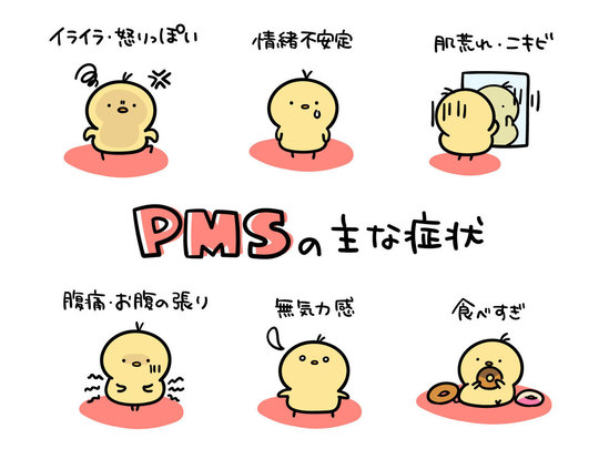生理の1-2週間前から、情緒不安定、イライラ、抑うつ、不安、眠気、集中力の低下、睡眠障害、自律神経症状としてのぼせ、食欲不振・過食、めまい、倦怠感、身体的症状として腹痛、頭痛、腰痛、むくみ、お腹の張り、乳房の張りなどがあります。